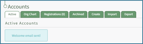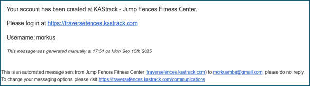 Send Welcome Email | Selecting “Send Welcome Email” from the context menu will automatically send a welcome email to the user without additional prompting. Confirmation that the welcome email was sent is indicated by a confirmation message stating “Welcome email sent!” that shows under the Active Accounts Page header. The user will receive an automated message sharing their username and a link to your organization’s KAStrack login page. The default message is shown below. Whether or not welcome emails are sent to a user when their account is created is a customizable choice designated on the Email Settings Tab of the Site Settings Module. WIKI LINK EMAIL SETTINGS TAB: SITE SETTINGS MODULE |