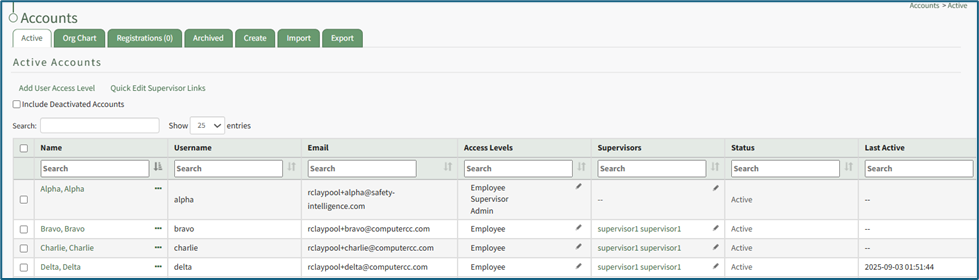 The Active Accounts Table shows account data. Account fields are used as the column headers. The default columns are Name, Username, Email, Access Levels, Supervisors, Status (active/inactive), and Last Active.
