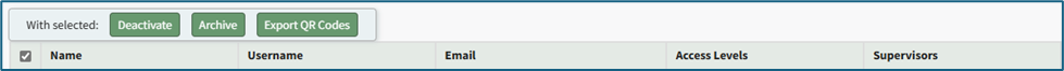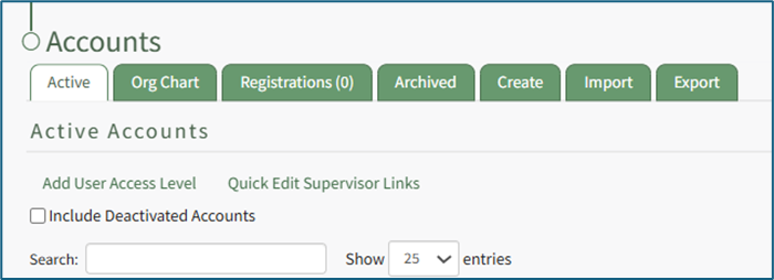 The Active Tab has two clickable links: Add User Access Level (allows for the alteration of a user’s access levels) and Quick Edit Supervisor Links (allows for the alteration of the users a supervisor manages.)