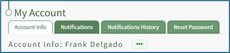 To reset your own password, select the Reset Password Tab on the My Accounts Page of the Accounts Module. The Account Info Tab can also be accessed from the Main Menu.