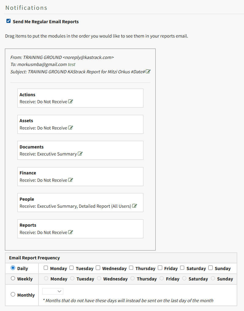 KAStrack generates and sends reports for the following modules: Actions, Assets, Documents, Finance, People, and Reports. If the “Send Me Regular Email Reports” box is checked, the user will be able to designate whether or not they wish to receive regular reports for each of those modules.