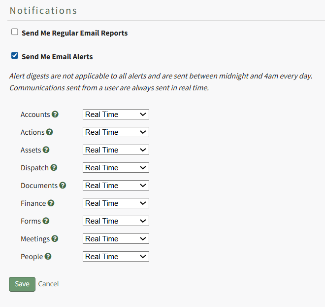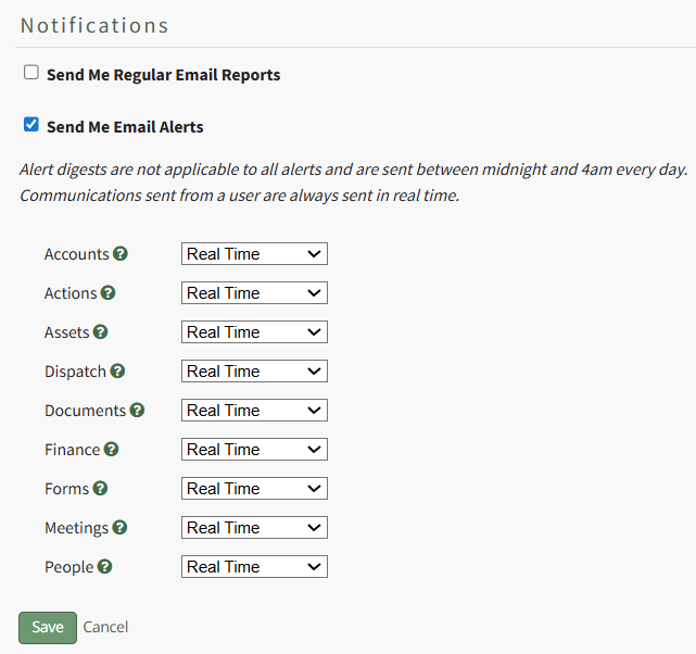 KAStrack sends email alerts for the following modules: Accounts, Actions, Assets, Dispatch, Documents, Finance, Forms, Meetings, and People. Each module has a dropdown menu with three options that designate when an email alert is sent: “Real Time”, “Digest”, and “Do Not Receive”.
