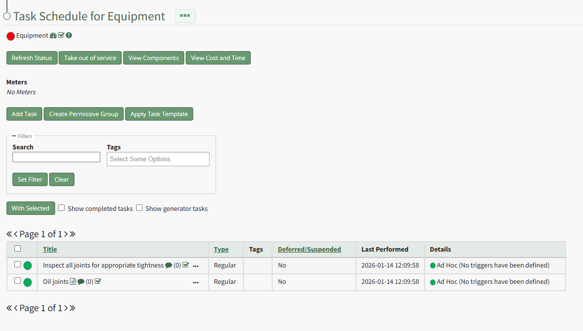 Each asset created in KAStrack will have its own Task Schedule Page which displays an asset's Task Schedule in tabular format. Tasks are added to an asset and managed from this page.