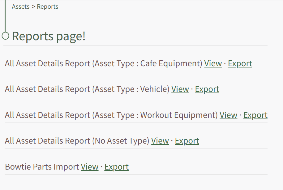 The Reports page still allows a user to view or export an All Asset Detail Report summarized by Asset Type.