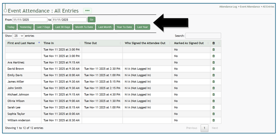 Select “All Entries”, opening the attendance log’s All Entries Page.