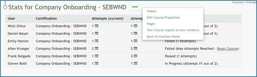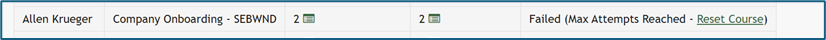 If a user fails a course after the maximum number of attempts, the course can be reset on the Course Stat page by selecting “Reset Course.”