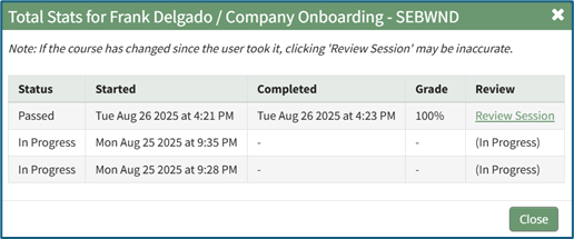 Selecting “Review Session” will allow an individual (with appropriate permissions) to see the individual’s responses to all questions, both graded and ungraded.