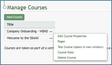 Test Course | “Test Course” opens a trial run of the course with quiz questions. Testing the course will not impact course stats. How To: Take a Course in Test ModeExisting courses are listed alphabetically in the table underneath the “New Course” button according to title. To manage a pre-existing course, select the three dot (…) icon to the right of the title and make a selection from the context menu. Select “Test Course (opens in new window)” to work through the course. This will open the course in a new window, displaying the course from the user perspective. When taking the course in Test Mode, results will not be recorded and will not impact course stats. | ||||||||||||||||||||||||||||||||