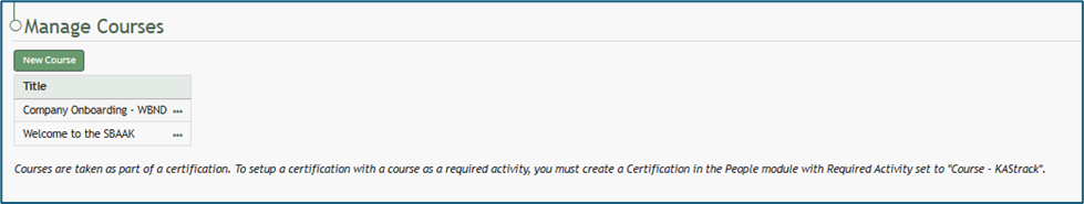 KAStrack uses Certifications within the People Module to assign a course to users. Before a certification with a required activity is set up, a user will not be able to take a course.