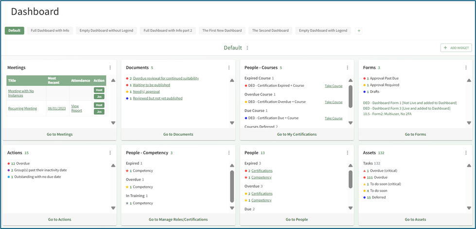 The default dashboard displays eight Widgets: People, Assets, Documents, Forms, Actions, People-Competency, People-Courses, and Meetings. Each widget is a summary of relevant information from that specific module. The placement of these module summaries can be customized by dragging and dropping widgets into your individual preference.