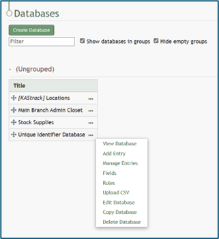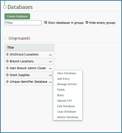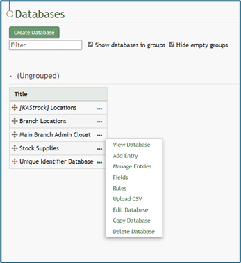 To delete a database entry, go to the Home Page of the Database Module. Click the three dot icon to the right of the database you wish to delete an entry in opening the database context menu.