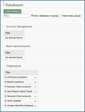 When groups have been added to the Database Module, the Database Table on the Home Page is broken into different sections for each group.