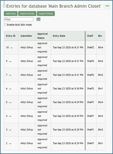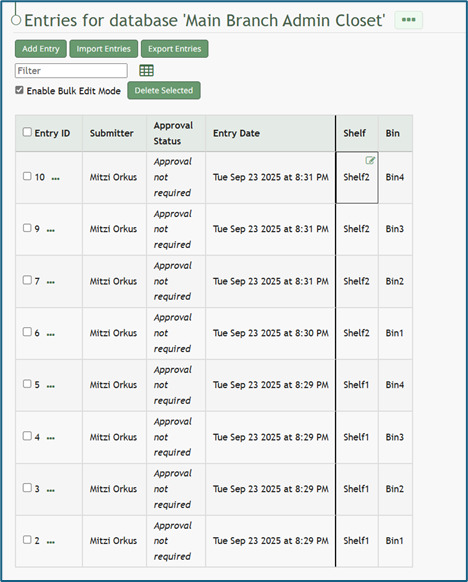 Select the “Enable Bulk Edit Mode” checkbox. A delete selected button appears. A checkbox now shows to the left of every Entry ID. Selecting checkboxes allows for the bulk deletion of entries.
