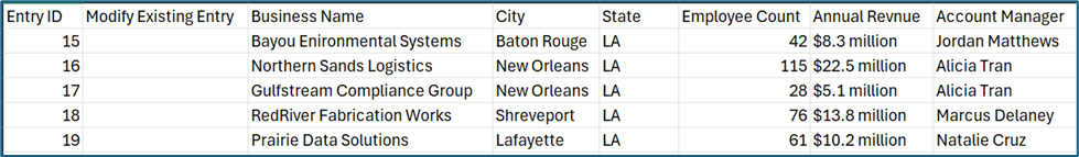 If database entries already exist in the database, the Entry ID column will contain the unique system generated ID for each pre-existing database entry. Leave this column blank if the row is to be imported as a new entry. The second column, Modify Existing Entry, should have a “Y” input if the existing entry is being modified and an “N” input if it has not been modified. Leave it blank if the entry is new.