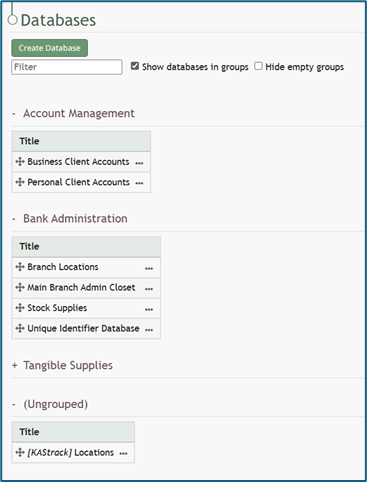 To place databases into groups, drag the database group by the directional arrow icon to the left of the Group Name into the desired group table above.