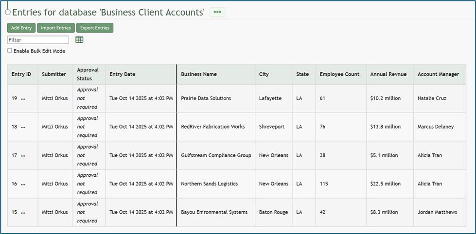If you select to “Save” a database entry prior to the creation of database fields, an entry will be assigned an Entry ID by the system and will show in the Entries Table. The submitter, approval status, and entry date will be logged.