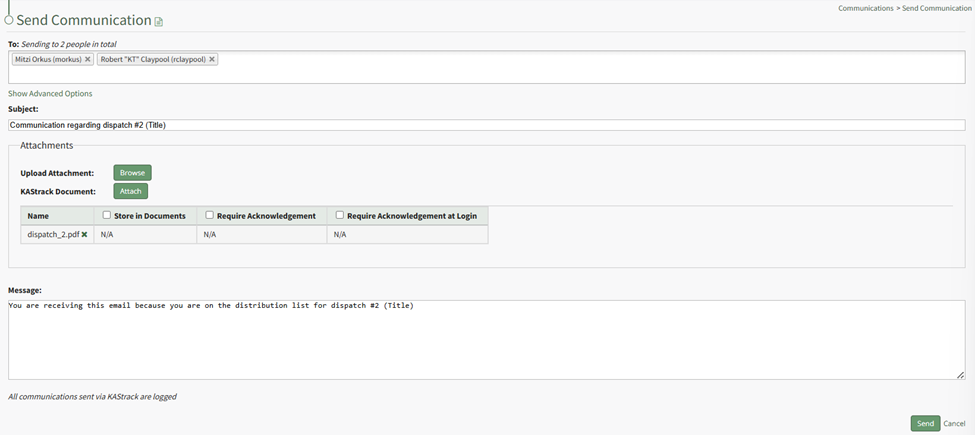 Distribution List | Users and certification roles can be added to the dispatch distribution list. How To: Add Distribution Lists to a DispatchDistribution Lists are the individuals designated to receive a PDF copy of the dispatch orders, sent through the KAStrack Communications Module. They can be pre-defined in the Dispatch Module To add distribution lists to a dispatch, open the specific dispatch you wish to add a distribution list to. Go to the Dispatch Module Home Page and alter the filter view as needed. Click the Dispatch Number or Title to open the specific dispatch details page. Distribution Lists can be added to a dispatch by selecting the plus sign icon to the right of the Distribution List column header. Selecting the plus sign icon to the right of Distribution List opens the Add People and Certification Roles Modal. Pre-defined distribution lists, users, and certification roles can all be selected via the dropdown menu. Pre-existing distributions lists can be created within this module. How To: Create a Pre-Defined Distribution ListTo create a new pre-defined distribution list, go to the Distribution Lists Tab on the Settings Page of the Dispatch Module. Click the “New Distribution List” button above the Pre-Defined Distribution List Table opening the New Distribution List Modal. Input the Title of the new distribution list. Clicking the Members field will open a dropdown menu of all Users and Certification Roles that can be added to the Distribution Lists. Multiple selections can be made. Select the “Save” button and the new distribution list will now show in the Pre-Defined Distribution List Table. Edit the display name if desired and select the “Save” button. The individuals on the distribution list will now show on the dispatch details page. An individual will only be listed once even if they are in multiple pre-defined distribution lists. Pre-defined Distribution Lists can be created on the Settings Page of the Dispatch Module and added to the dispatch. How To: Create a Pre-Defined Distribution ListTo create a new pre-defined distribution list, go to the Distribution Lists Tab on the Settings Page of the Dispatch Module. Click the “New Distribution List” button above the Pre-Defined Distribution List Table opening the New Distribution List Modal. Input the Title of the new distribution list. Clicking the Members field will open a dropdown menu of all Users and Certification Roles that can be added to the Distribution Lists. Multiple selections can be made. Select the “Save” button and the new distribution list will now show in the Pre-Defined Distribution List Table. | ||||||||||||||||||||||||||||||||||||||||||||||||