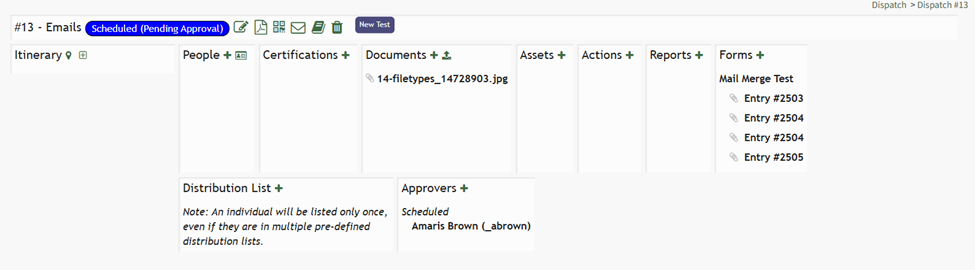 The header of the Dispatch Details Page states the Dispatch ID number, title, and status. If approval is pending for the dispatch, it will be indicated here. To the right of the status are icons that serve as action quick links. Any tags associated with the Dispatch are displayed to the right of the icons.