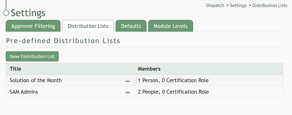 The Distribution Lists Tab on the Settings Page of the Dispatch Module is where new pre-defined distribution lists are created. Distribution List members can be People (Users) or Certification Roles. The Pre-defined Distribution List Table shows the title of the distribution list as well as the number of people and certification roles that are members of the distribution list.