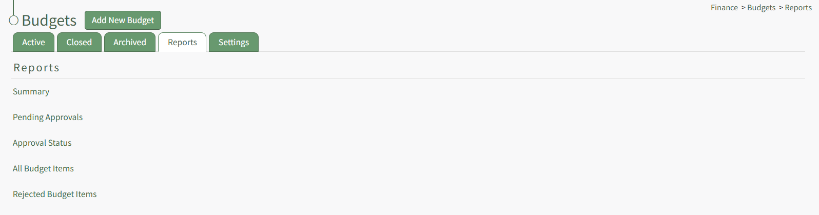 The Reports Tab highlights system reports from the Reports Module that are relevant to budgets. System Reports displayed on the Reports Tab include the Budget Summary Report, Pending Approvals Report, and Approval Status Report.