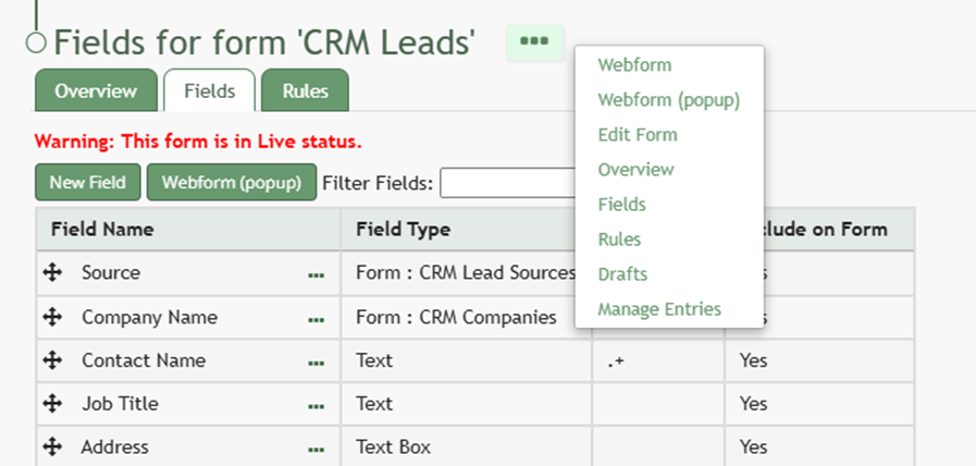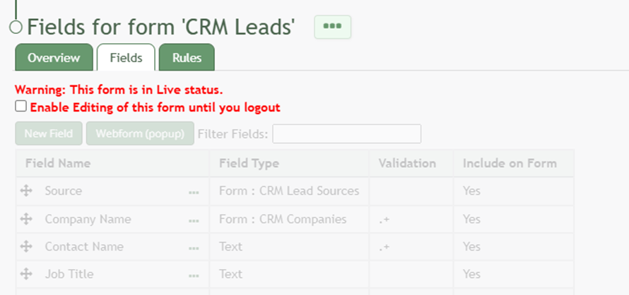 When a form is in Live Status, you will be required to select a checkbox to enable editing of the form. You will not be able to access the Fields Tab and make changes until you do so.
