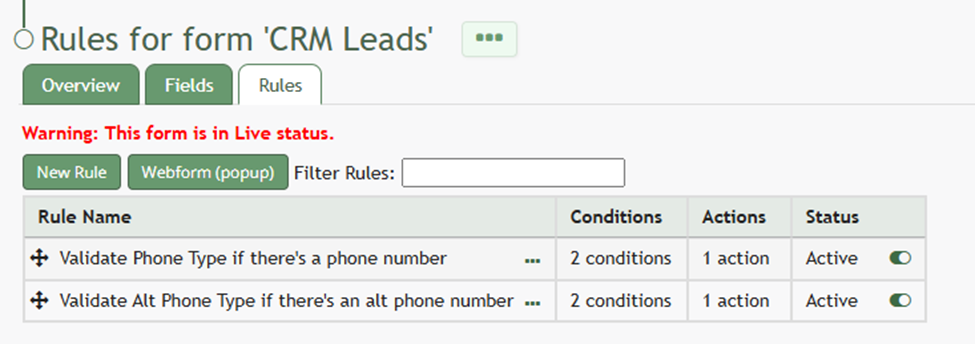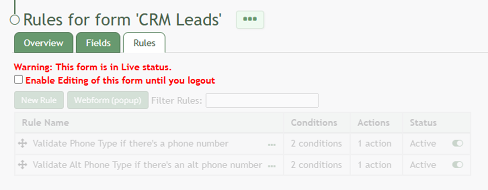 When a form is in Live status, you will be required to select a checkbox to enable editing of the form. You will not be able to access the Rules Tab and make changes until you do so.