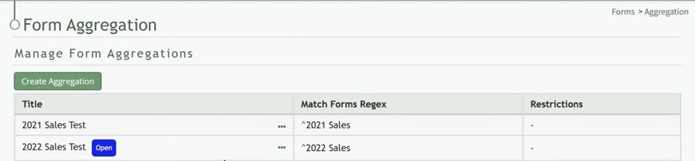 An aggregation is a report generated from form data. Form aggregations take the information from similar forms and aggregates them into one form. (For example, three monthly forms can be aggregated together to create one quarterly aggregation report.) The original forms will still exist independently after aggregation.