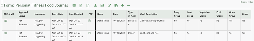 When forms are submitted in KAStrack, the form entries can be viewed in the Reports Module. Each entry will be recorded with a database entry ID, approval status, the username of the individual who submitted the entry if they are a KAStrack system user, the entry date, and the most recent entry update.