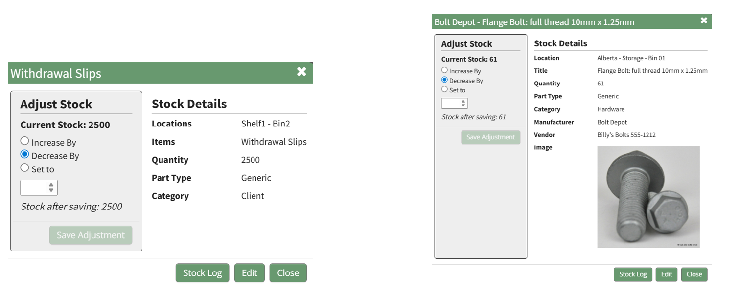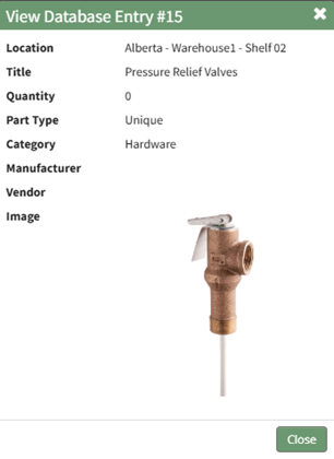 The Stock Database is created for general or stock inventory items that do not have a unique identifier. The fields included in the Stock Database will show on the modal for each stock item in the inventory. All inventories are required to integrate with a stock database.