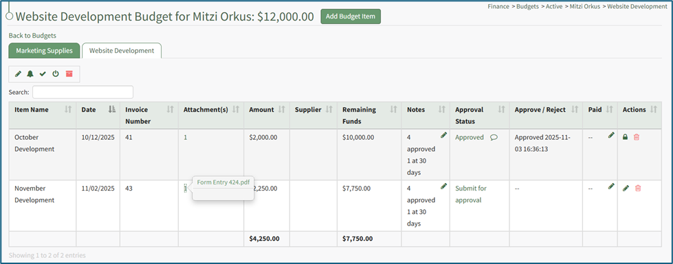 You can also access your attachments by clicking on the budget name or the eyeball icon in the actions column of the Active Budgets Table which opens the Budget Items Per Budget Table.
