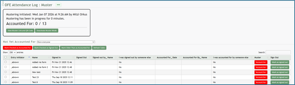 Once Emergency Muster has been activated, the page will change. The muster summary at the top of the page communicates that muster mode has been initiated.