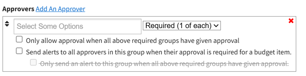Checkboxes provide the option to “Only allow approval when all above required groups have given approval” or “Send alerts to all approvers in this group when their approval is required for a budget item”. If the option to send alerts when approval is required is selected, another checkbox is enabled to “Only send an alert to this group when all above required groups have given approval”.