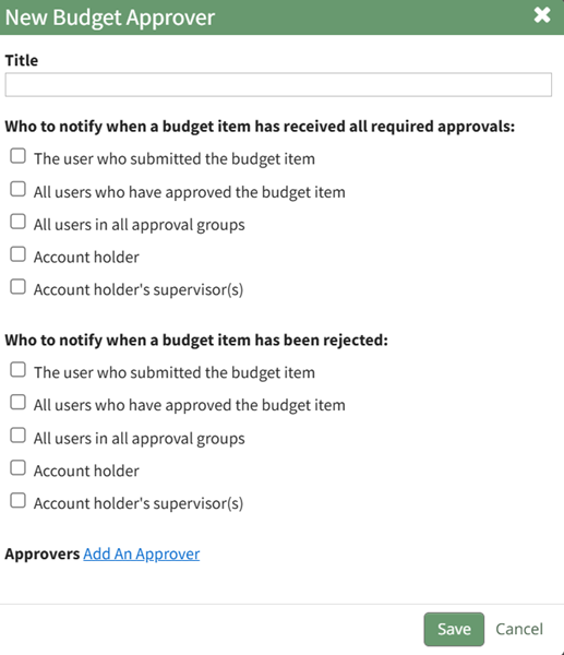 Use the checkboxes to identify who should be notified when a budget item has received all required approvals abd when a budget item has been rejected. Options for both fields include: The user who submitted the budget item, all users who have approved the budget item, all users in all approved groups, account holder, account holder’s supervisor(s).