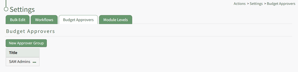 To create a new budget approver group in the action module, select Settings under the Action Module on the Main Menu. Open the Budget Approvers Tab.