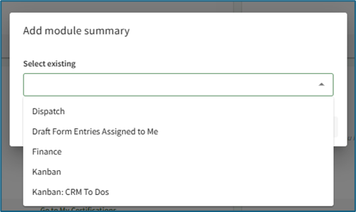 Any possible module summaries that are not yet included on the current dashboard will show in a dropdown menu on the modal.