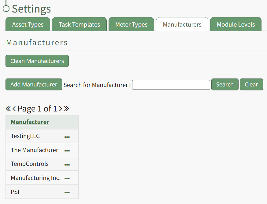 To add a new manufacturer, open the Manufacturer Tabs on the Settings Page in the Assets Module from the Main Menu.
