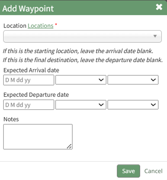 If this waypoint is the starting location or final destination, leave the arrival date / departure date blank.