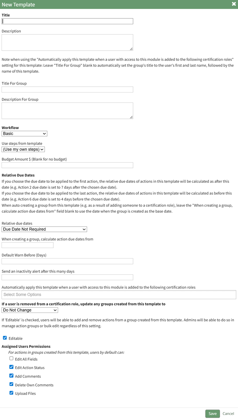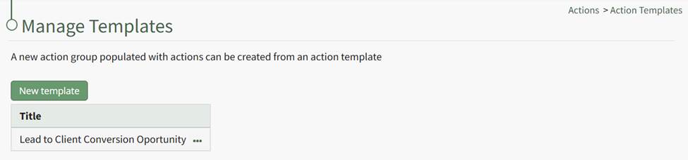 To create a New Action Group Template, select Templates from the Actions Module Main Menu, opening the Manage Templates Page.