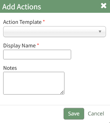 Actions can be added to a dispatch by selecting the plus sign icon to the right of the Actions section header. Selecting this icon opens the Add Actions Modal.