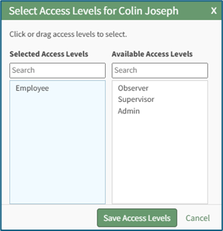 The modal will display two columns: Selected Access Levels (what has been assigned to the user) and Available Access Levels (what can still be assigned). Drag and drop the designations as desired or click an item to move it from its current column to the other.