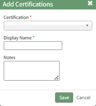 Certifications can be selected from the dropdown menu. Edit the display name as desired, and add any notes relevant to the certification.