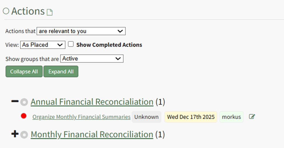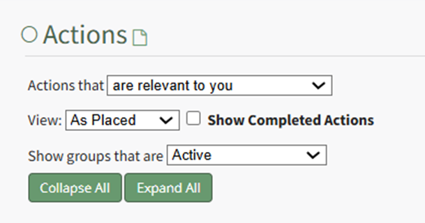 Use the filters to pull up the relevant action by Action Group (As Placed), Due Date, or User. If filtering by Action Group or Due Date, expand the section to display the actions.