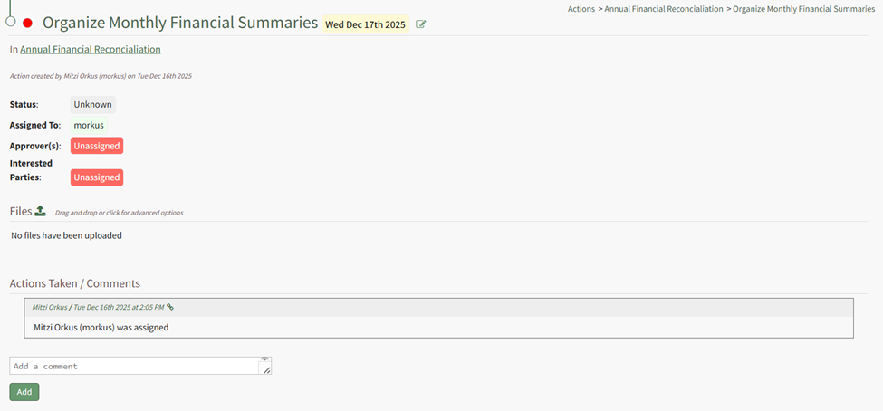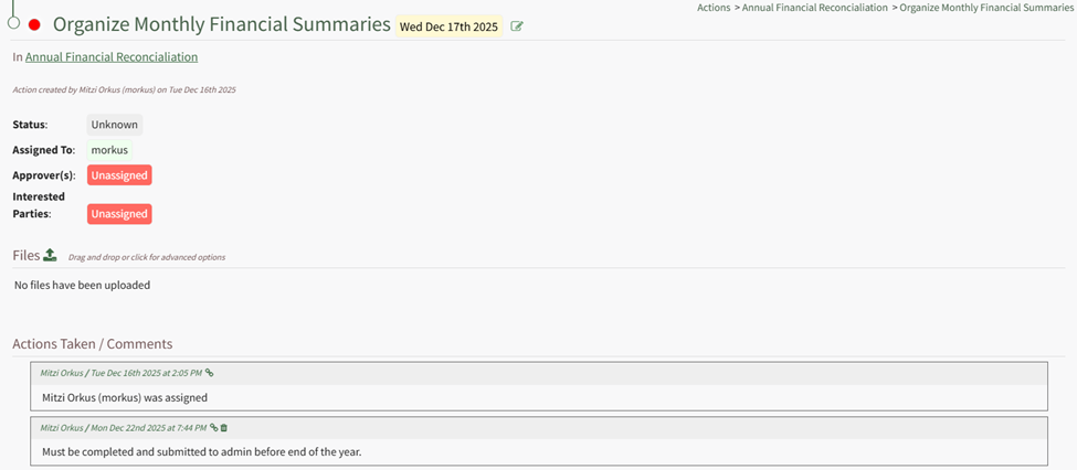 The comment, user who added it, and the date and time are recorded and now visible on the Action Page.