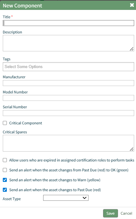 The fields on the New Component modal ask for the same information on the New Asset Modal. For a detailed description of the fields, refer to the How To Create a New Asset page.