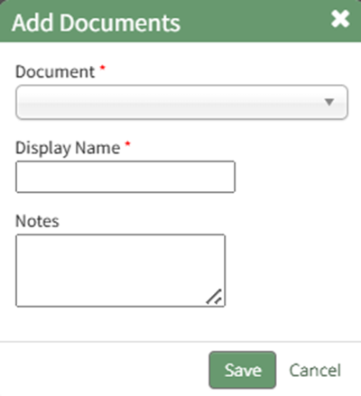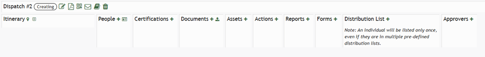 Documents can be added to a dispatch by selecting the plus sign icon to the right of the Documents column header.