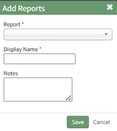 Select the report you wish to add to the dispatch from the dropdown menu. Edit the display name if desired. Include any notes relevant to the report and select the “Save” button.