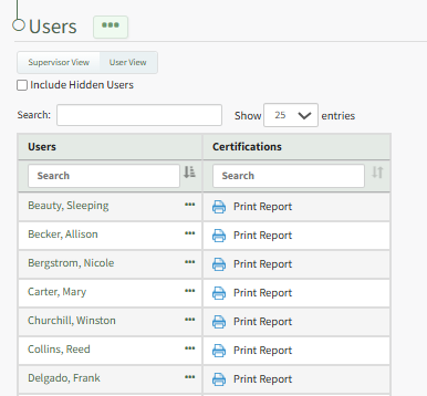 To add comments to a user's submitted certification records, open the Users Page in the People Module from the Main Menu. Identify and click the name of the individual whose submitted certification you wish to comment on.