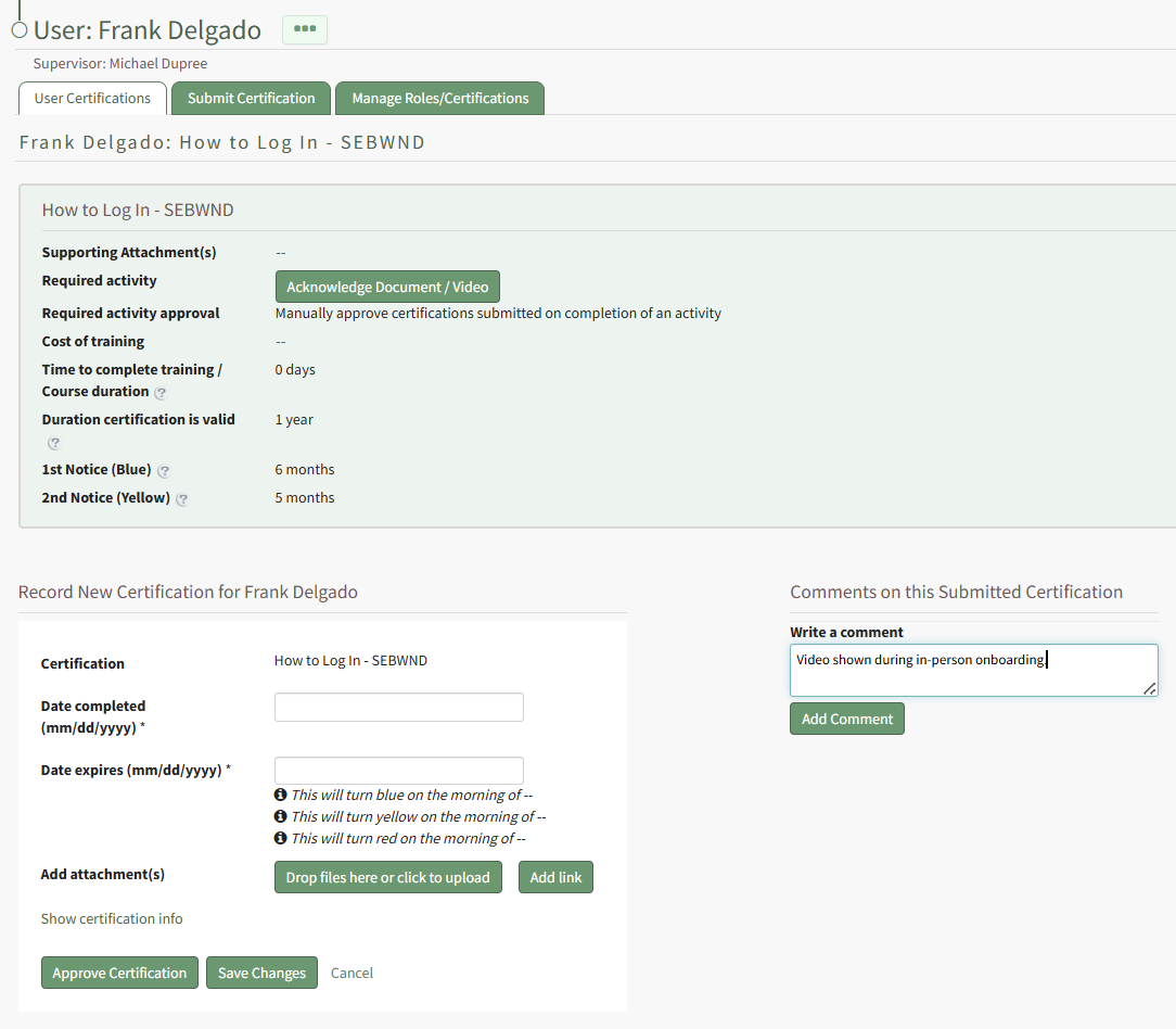 This opens the User's Certification Details Page. Scroll to the bottom of the User Certifications Tab. To the right of the certification record section is a Comments Section.