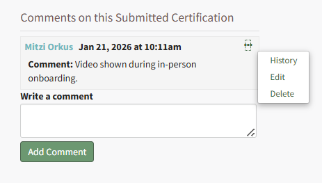 Add/Edit/Delete Comments to a User's Submitted Certification Records