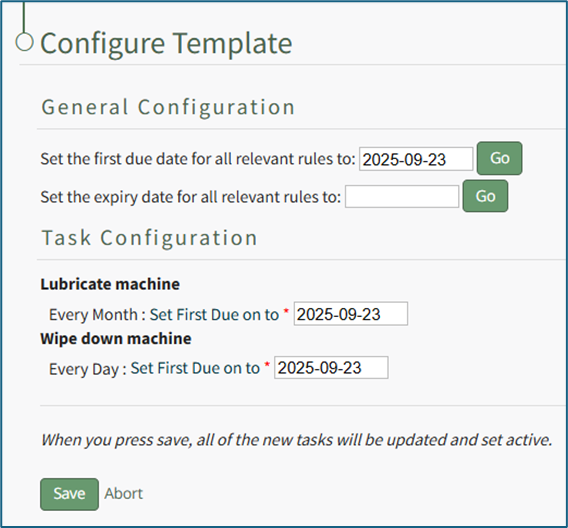 Once the task template has been configured, select “Save” and all of the new tasks will be updated and set active.